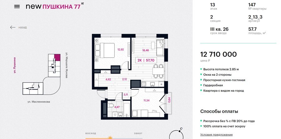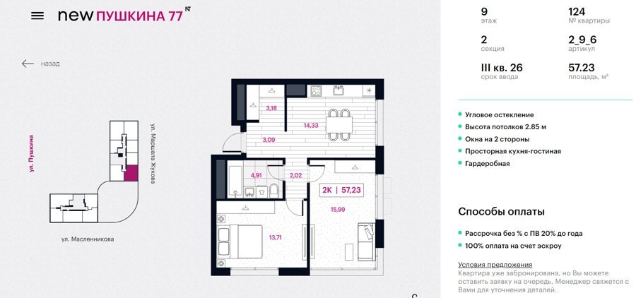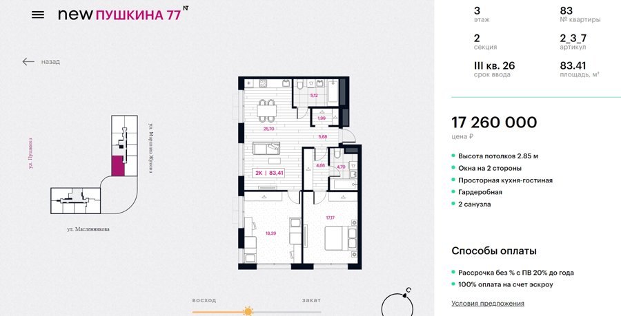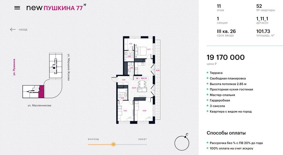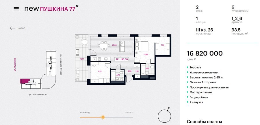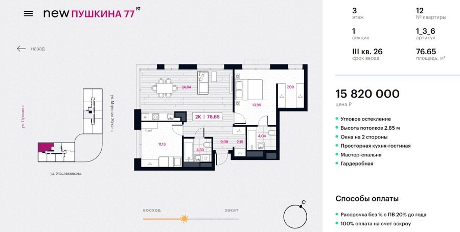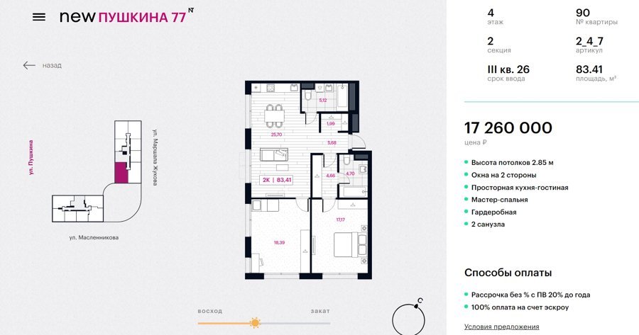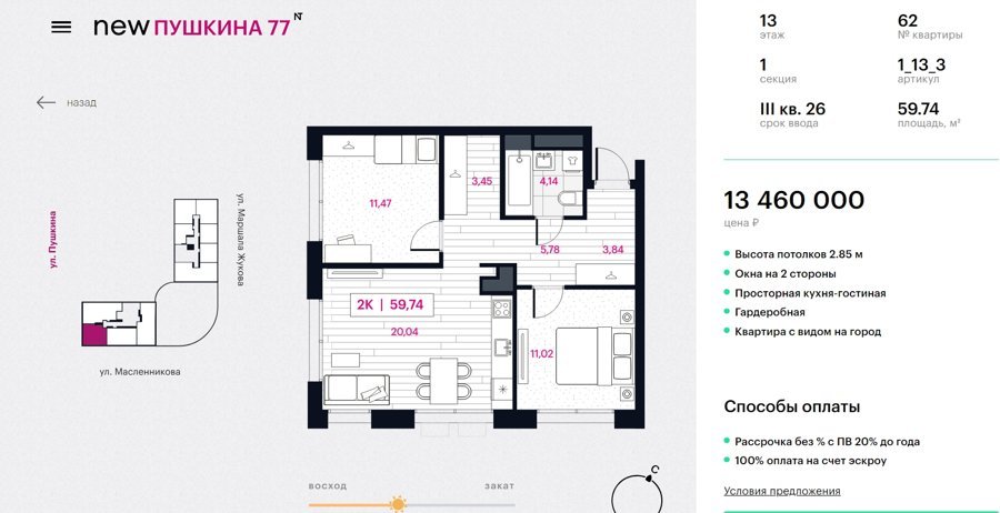 ЖК находится административно в центральном районе Омска в 3 минутах езды от Любинского проспекта (историческая часть города) на пересечении улиц известных любому омичу Масленикова, Маршала Жукова и Пушкина.